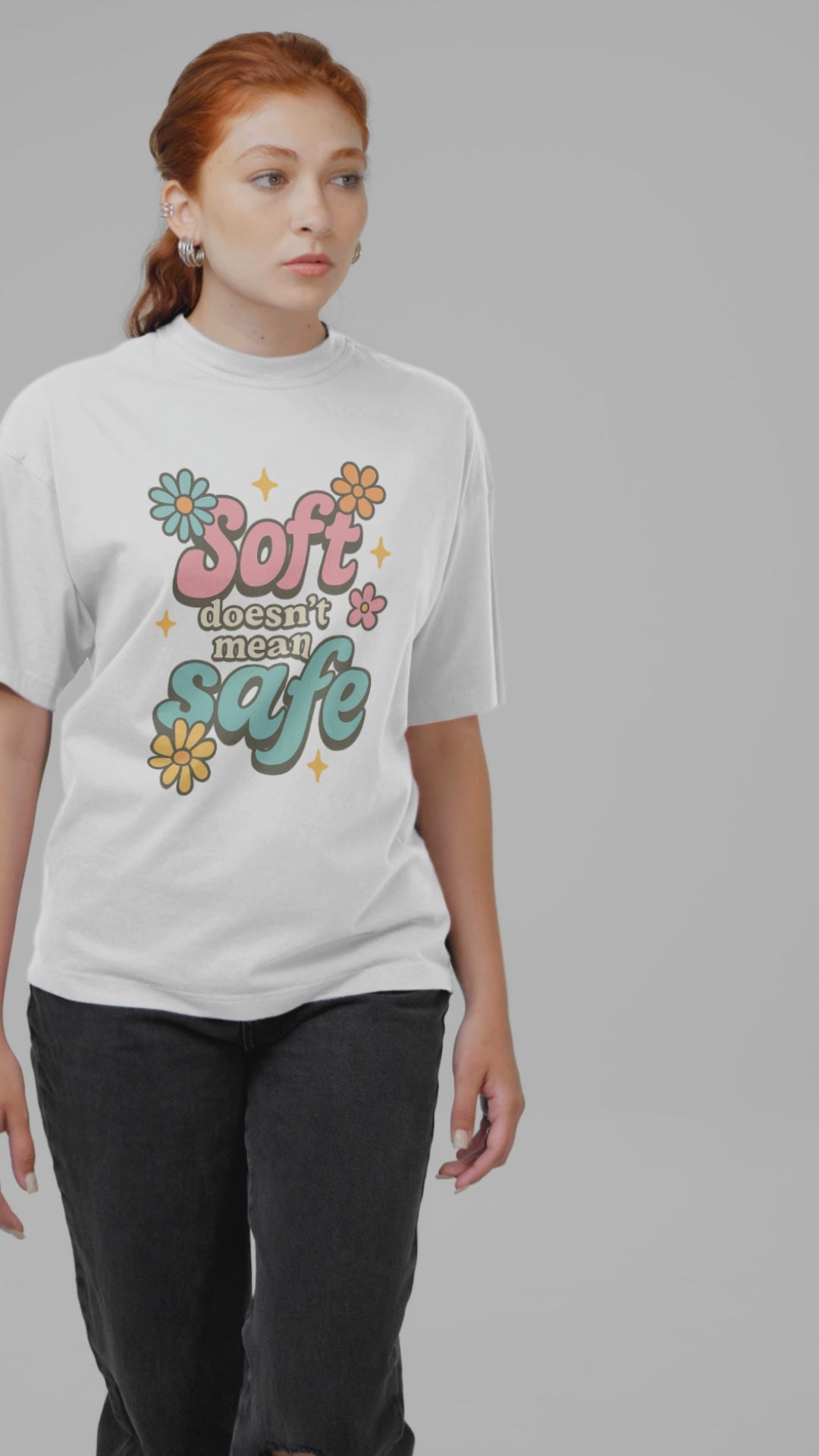 The “Soft Doesn’t Mean Safe” tee is your new go-to for reminding the world that softness and strength are not opposites—they’re a threat when combined. Featuring a dreamy retro color palette and groovy floral graphics, this shirt says what you’re thinking in the boldest, cutest way possible.